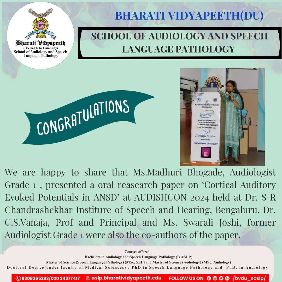 Big Cheers to Ms Amaira Pusalkar a hearing aid user who underwent aural rehabilitation and auditory Verbal therapy at BV DU SASLP