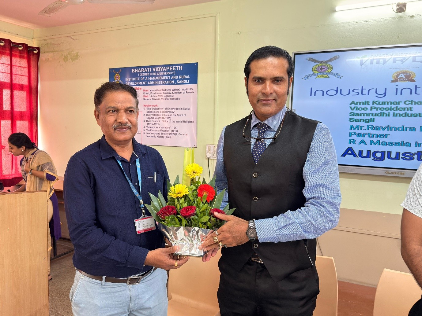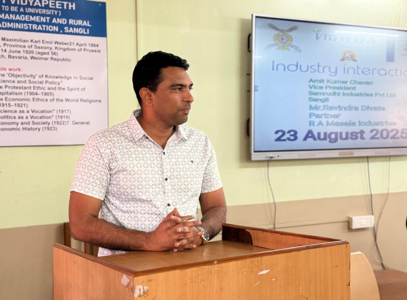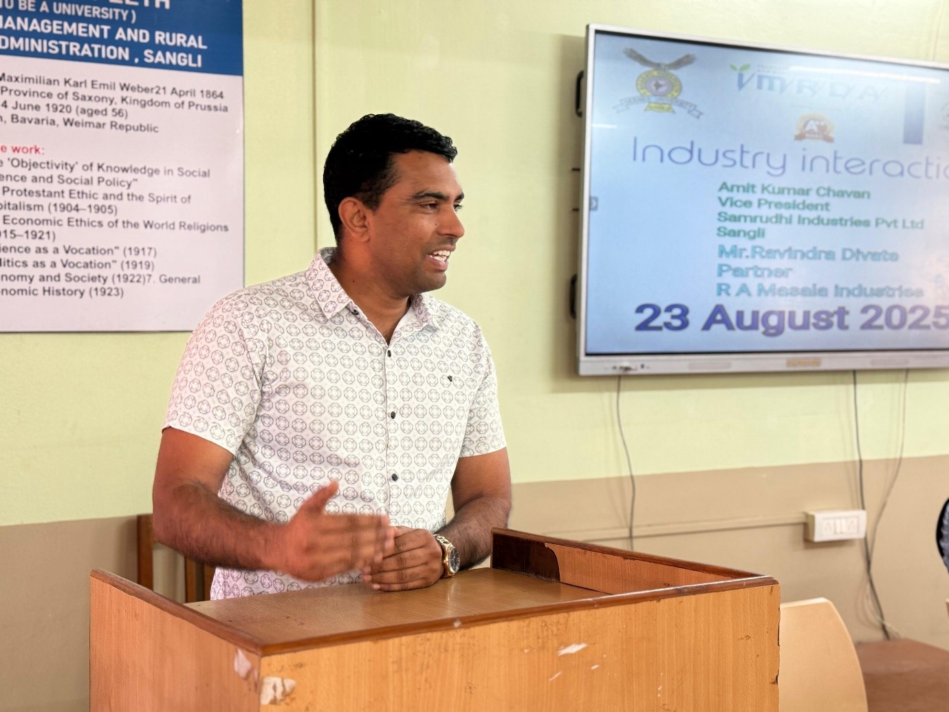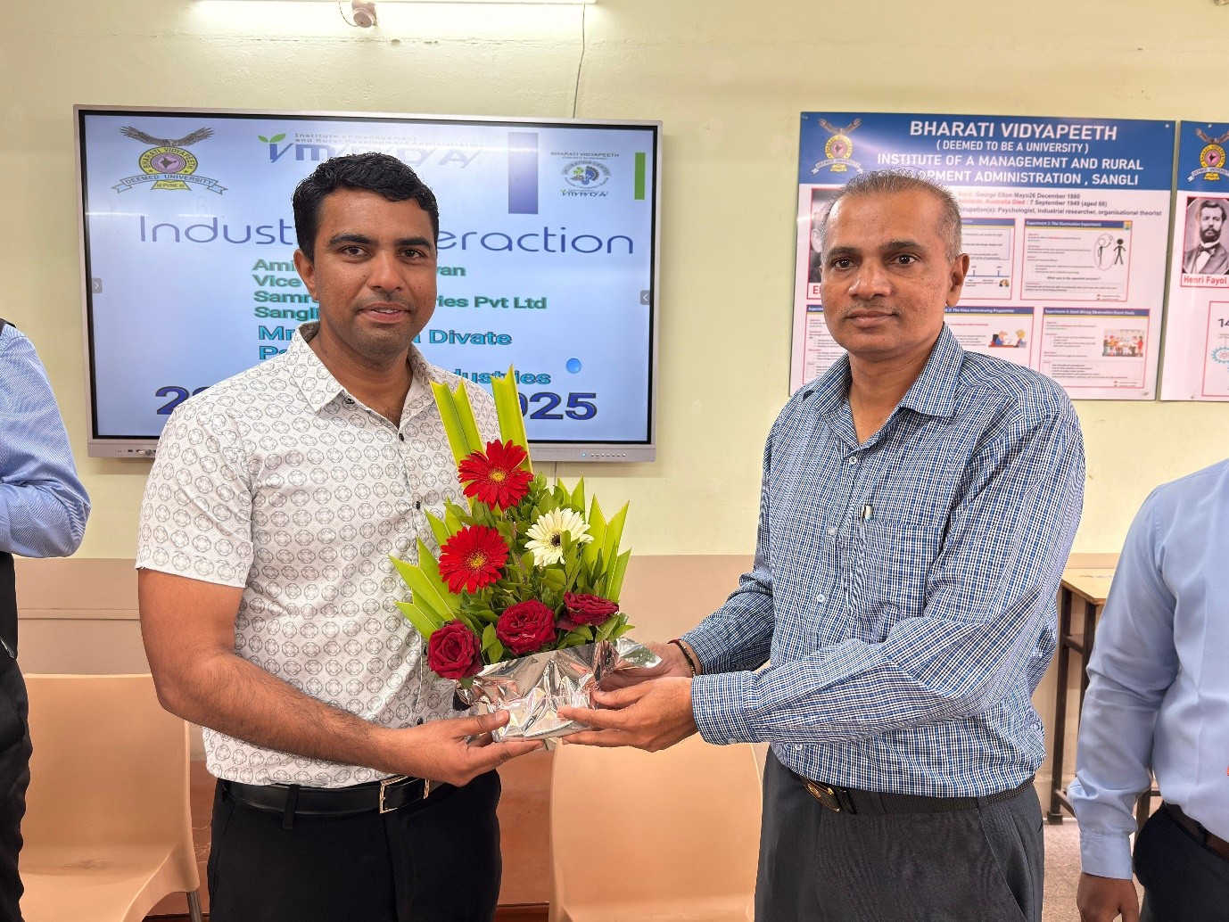 An insightful Industry Interaction Program was organized at the institute on 23rd August 2025. The session aimed at bridging the gap between academia and industry, providing students with practical insights into real-world business practices. The event featured distinguished speakers: Mr. Amit Kumar Chavan, Vice President, Samruddhi Industries Pvt. Ltd., Sangli and Mr. Ravindra Divate, Partner, R.A. Measle Industries.