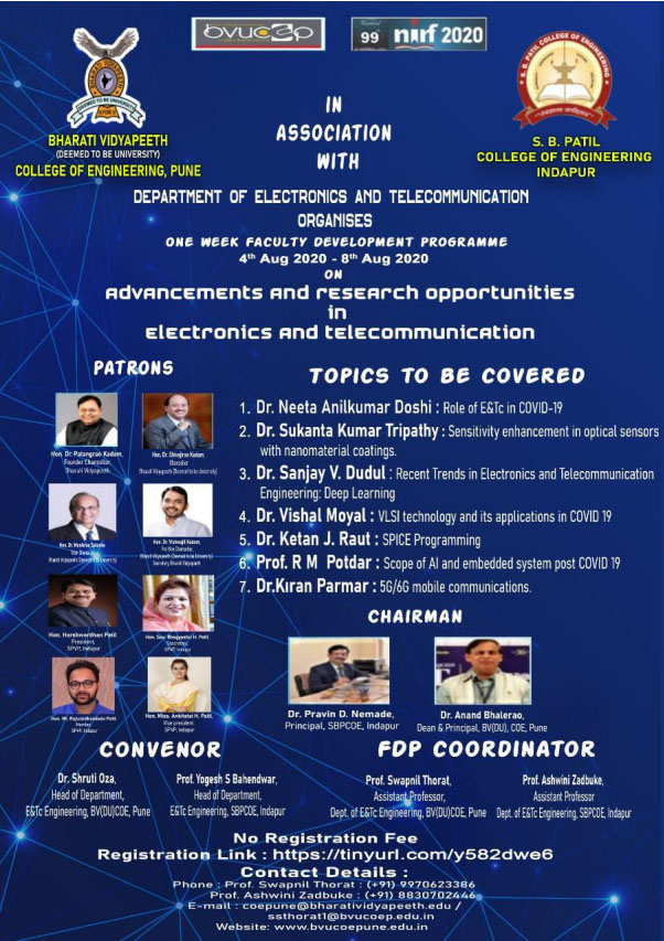 Department of Electronics and Telecommunications of Bharati Vidyapeeth(Deemed to be University) College of Engineering-Pune had organized 1 Week faculty development program on “Advancements and Research opportunity in Electronics and Telecommunications” in association with Shahajirao Patil Vikas Pratishthan's S.B. Patil College of Engineering-Indapur during 4th August 2020 to 8th August 2020. Keeping in mind the ongoing pandemic and large number of registered participants (More than 800) from all across India, mode of conduction of this FDP was online through Microsoft Teams.